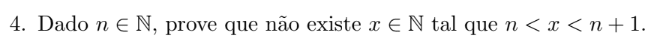 Mas $x-n$ está entre 0 e 1, e acabamos de provar que não existe natural entre 0 e 1. Logo, chegamos a um absurdo.